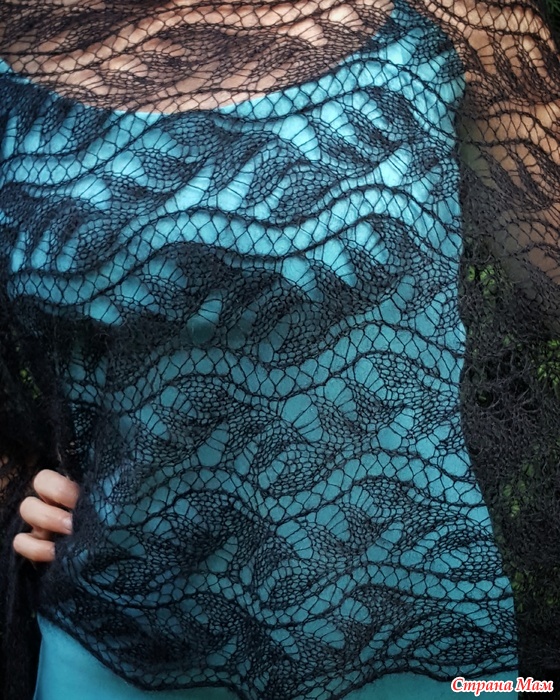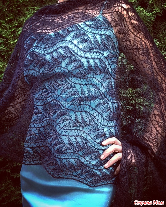 У меня готов еще один палантин. Теперь в черном цвете. Пряжа итальянский супер кид мохер70%+нейлон30%. 1100м/100гр. Вес палантина 75 гр. Размер 75х170 см. Спицы 3.5