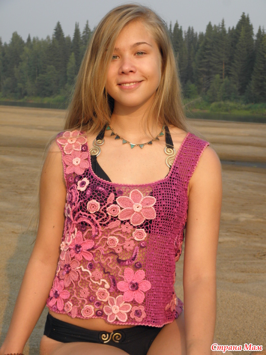 Топ был готов в октябре, Тамару я довязала до последнего сантиметра, но получился он не длинным, даже, я бы сказала, коротким. Если надевать с джинсами или юбками с низкой посадкой - пупок будет виден при малейшем движении рук вверх.