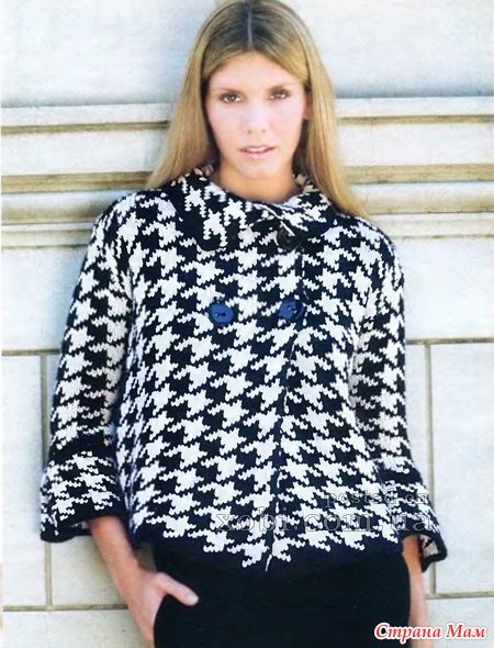 Материалы: по 400 г пряжи (100% акрил) средней толщины черного и белого цветов, 4 пуговицы черного цвета; спицы № 5.