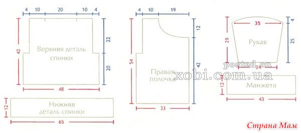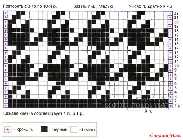Для нижней детали спинки нитью черного цвета набрать 110 п. и вязать лиц. гладью. Через 2 р. продолжить жаккардовым узором по схеме. На общей высоте 12 см закрыть п. Так же связать манжеты, но набрав для каждой из них по 74 п.