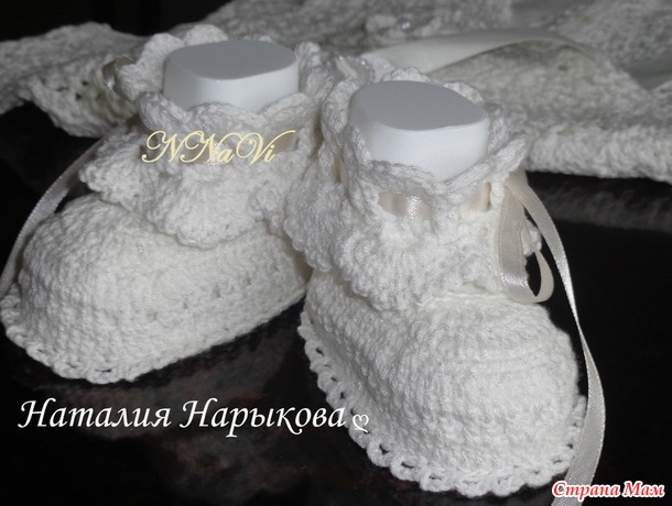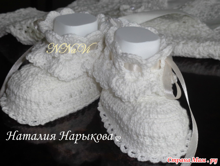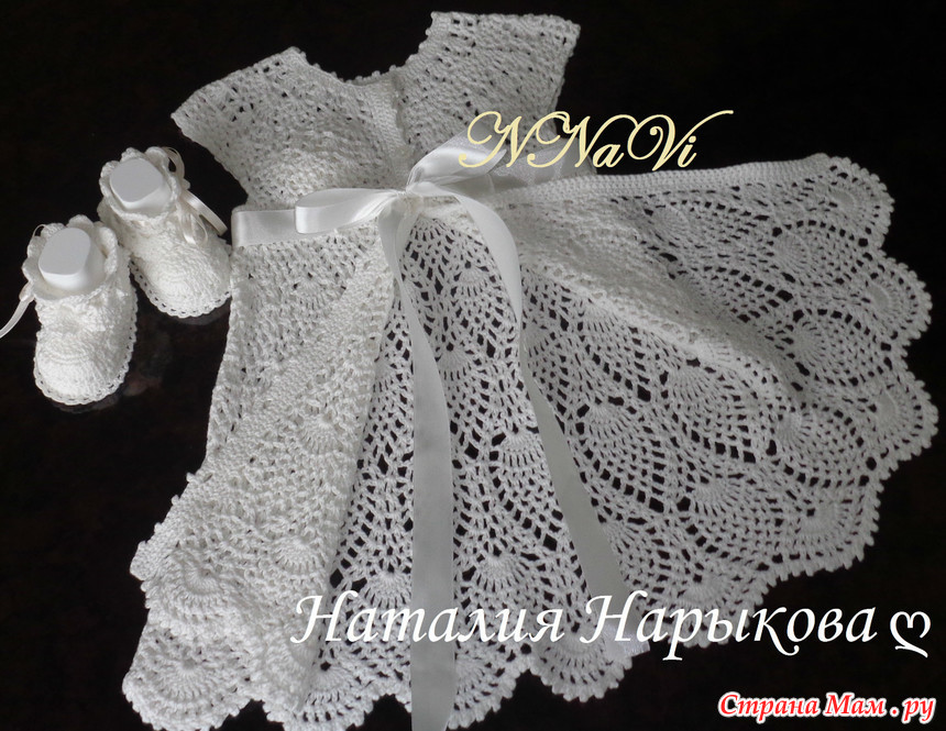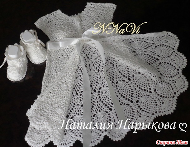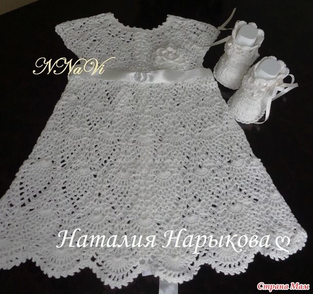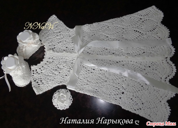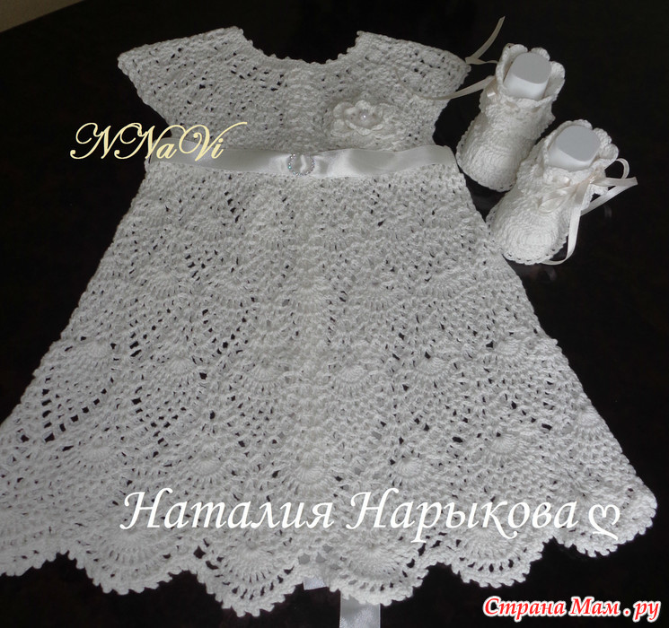 К платью еще связала пинеточки, чепчик пока в работе.