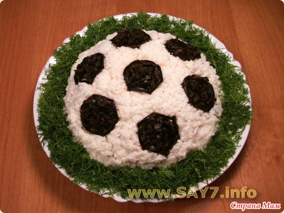 украсить салат по вкусу. Я украсила в виде футбольного мяча.