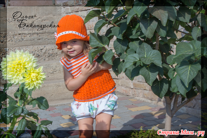 Фото супер. Будто дочка прячется и не хочет уезжать с дачи. Комплект, как всегда, наикрасивейший. Дочка в нем маленький мандаринчик