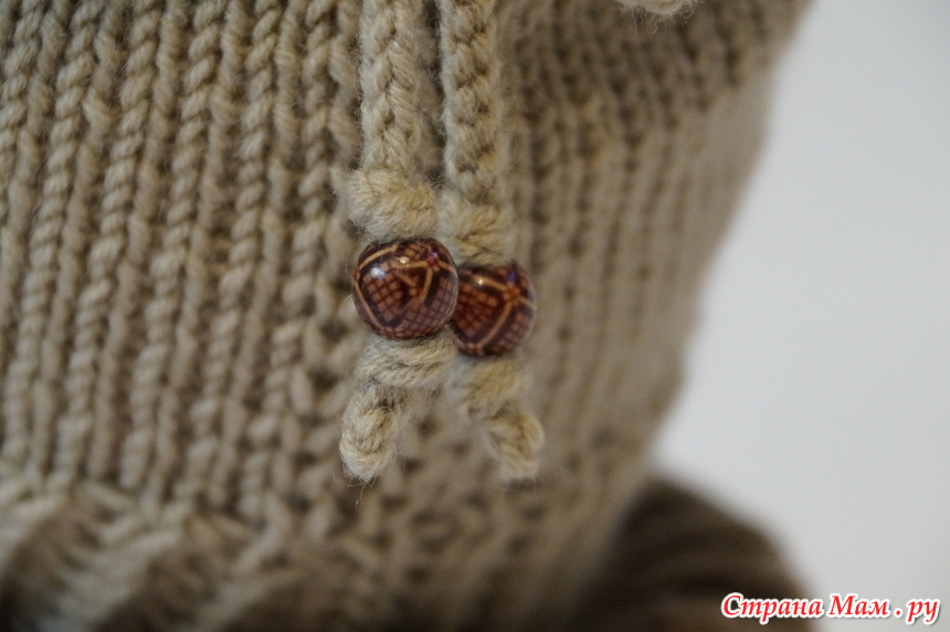 Далее гладь 40 рядов. На сужение я в двух последних( лицевых) рядах сделала сокращение петель по 2 вместе через одну петлю. Стянула нитью и добавила декоративный шнурок, связанный крючком. На концы шнурка добавила декоративные бусы (дерево).