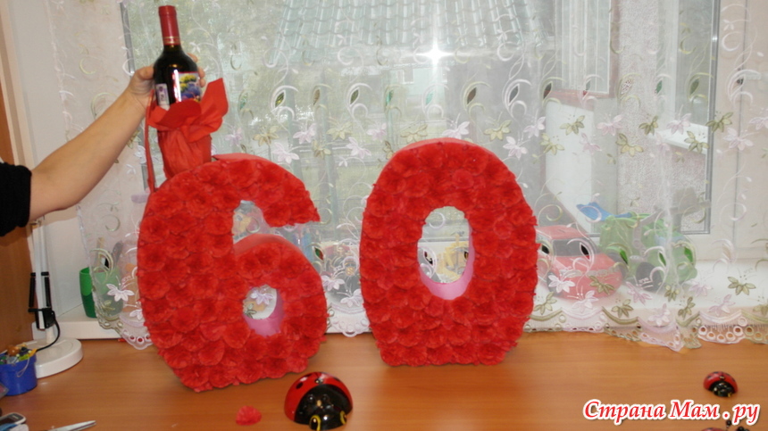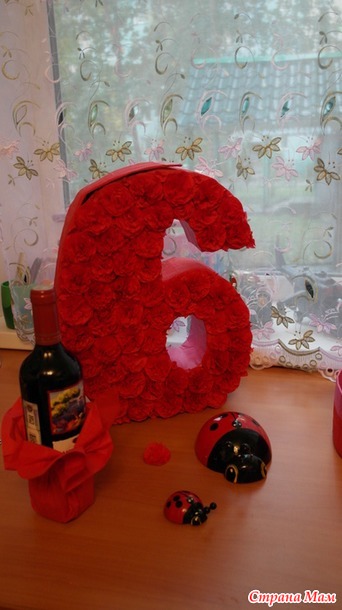 Второй мой опыт, цифр для юбилея ( из салфеток и подарочной бумаги), в 6-ке прячется вино,