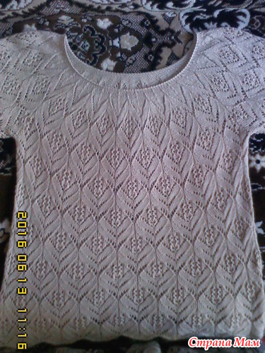 Вязала его вкруговую снизу, потом делила на перед и спинку. Ничего нигде не приталивала, потому что узор очень пластичный и на фигуре ложится как надо. Плечевые швы закрыты методом 3-х спиц, пройму обработала крючком сбн, горловину никак не обрабатывала.