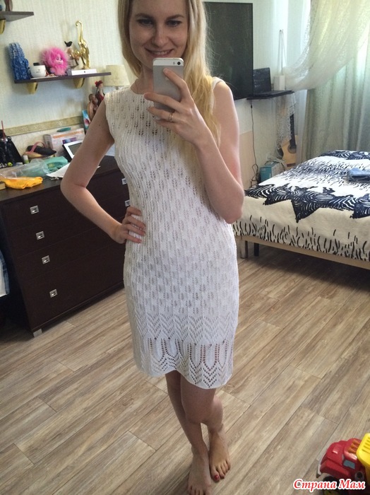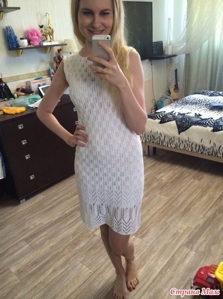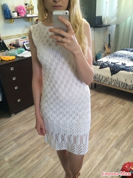 К этому палантину были даны схемы и я начала мучить образцы практически из всех хлопковых ниточек из моих запасов. Остановилась я на уже полюбившейся Пехорке Жемчужной (425м/100гр, 50% вискоза, 50% хлопок, спицы 2, ушло 2 моточка). Изначально платье задумывалось полуприлегающим силуэтом со спущенной проймой и широким вырезом горловины, чтоб спускалось на одно плечо. Но я не учла, что эта пряжа вытягивается и получилось классическое платье-футляр