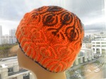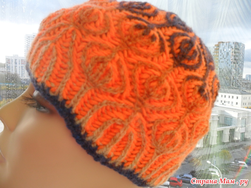 шапочка связана из ниточек кауни и оранжевого акрила.. чтобы внутри( где акрила больше.. было мягко).. а снаружи было ярко и красиво.. обвязку вязала крючком.. а то как-то широковато было..