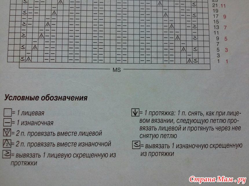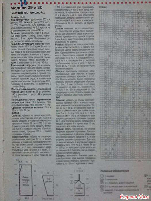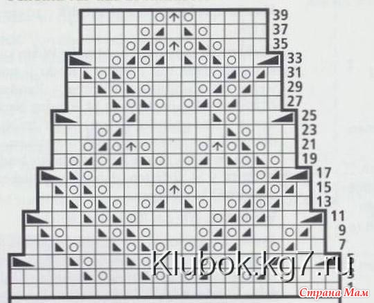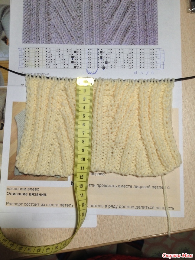 Самый первый образец вязала на спицах №4, мне показалось рыхло, решено купить спицы 3.5, в магазине их не оказалось, взяла книт про квадратные 3.75 - продавец сказала что на квадратных петли получаются меньше, чем на таком же размере на круглых. Пришла домой и села вязать образец и разбираться в схеме. Первый раз связала - получилась полная ерунда, распустила и снова начала вязать, но уже немного включив логику. Во-первых на схеме в середине есть лишние полосочки в центре и т. к. я уже провязала немного резинки 2х2, то решила эти столики просто вынести по сторонам. На фото образца со схемой я ручкой отметила какие столбики я убрала. Галочка на схеме - это накид из протяжки (чтоб получилось без дырочки), черный квадратик я провязывала по рисунку нижнего ряда. А треугольник с точкой внутри (который не описан внизу) это провязывание двух петель вместе изнаночной. Еще один нюанс - во всех рядах указан рисунок лицевой стороны, т. е. первый ряд нужно вязать как по схеме, а второй наоборот (где указана лицевая вязать изнаночной, а где изнаночная вязать лицевой). Пока разбиралась со схемой я поняла что такое йога для мозга, хорошо у меня технический склад ума. Завтра провяжу еще пару рапортов, сделаю ВТО посчитаю сколько мне нужно петель и потом уже приступлю к вязанию. Считать я не умею и всегда все равно перевязываю все, надо учится. Где то читала что надо бы считать для резинки по лицевой глади, попробую посчитать и по рисунку и по глади. Данная схема рассчитана на три столбика резинки из которых составляется половина елочки рисунка. Рассмотрев фото с кофточкой такая елочка состоит из 7 таких столбиков. И судя по схеме нам нужно будет следить только за первым и последним столбиком, остальные вяжутся по рисунку и сами наклоняются. Если я не права поправьте меня.
