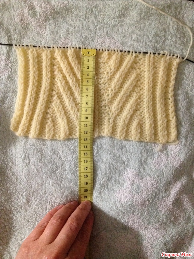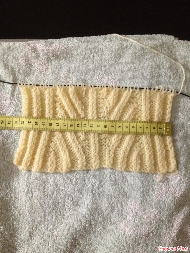 связала 3 рапорта в высоту получилось 30 рядов (вместе с резинкой) и 50 петель в ширину, измерила что получилось и намочила и тоже измерила