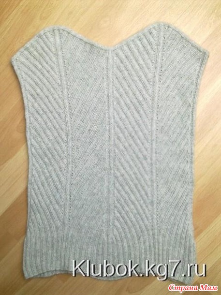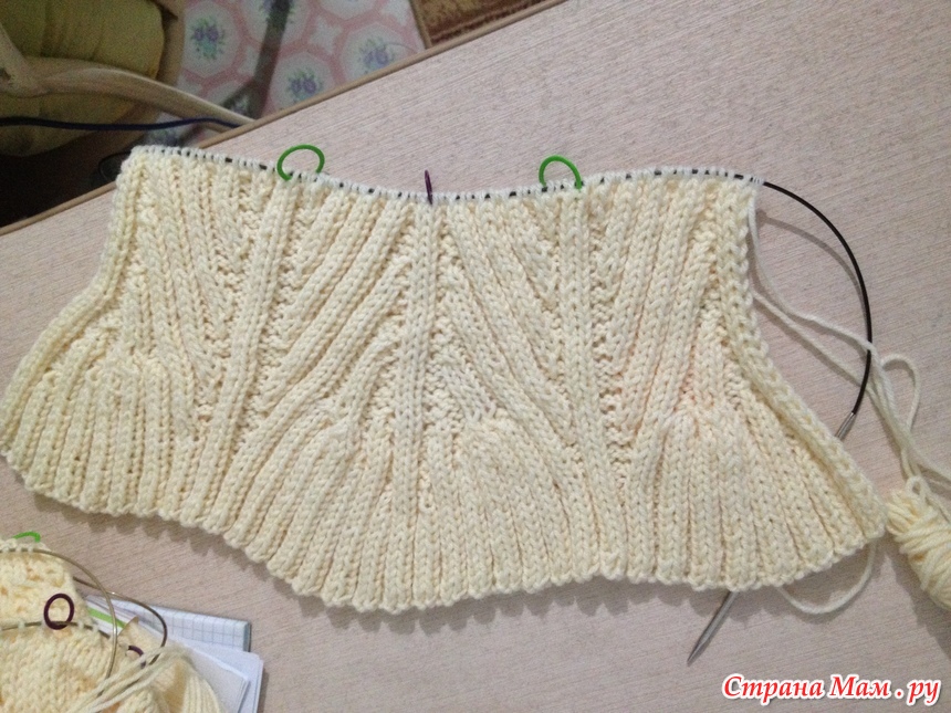 на самом деле просто очень эластичное получается и после провязки петли становятся как надо. Ни от кого не услышала как нужно вязать кофту, как строить выкройку, окаты рукавов и тд. и решила себе заказать книги по вязанию женских и мужских основных свитеров. А пока нашла как вязать рукав от верха. Связала 58 рядов спинки и думаю хватит или нет. И чтоб не гадать (ведь длина будет зависеть от кокетки), начала вязать кокетку и намочила спинку, чтоб сразу понимать как будет выглядеть. На кокетку решила не вязать образец, если что распущу, все равно не пойму как считать кокетку и сколько надо петель. Набрала 184 петли - т. к. она по фото состоит из 8 рапортов по 23 петли, Провязала два ряда лицевыми, спицами побольше №4. Теперь возникает еще вопрос, что за жгутик по верху корсета - как его вяжут?