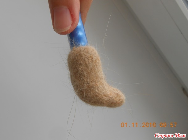 второй (левый) валенок на "распялке" - ручке зубной щётки