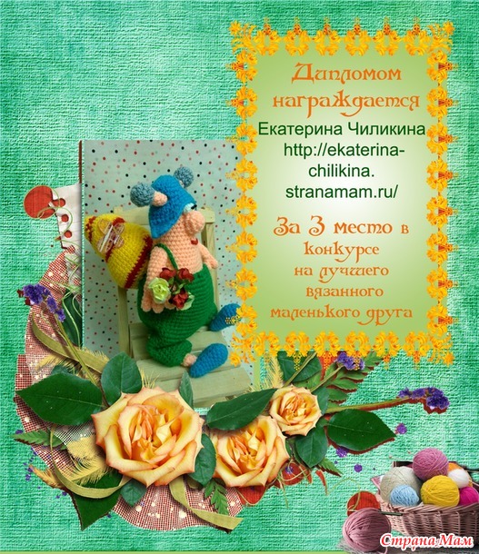 . Я не очень люблю участвовать в конкурсах, но решила все же поддержать компанию и поучаствовать в конкурсе " Мой маленький друг". Как раз увидела один замечательный пост Ирины под ником Сократовна, с текстильным улитом https://www.stranamam.ru/post/11813357/, я в него влюбилась и захотела такого же, но так как я не умею рисовать и грунтовать то приходилось только мечтать, но Ирина скинула мне ссылку на вязанного улита, за что я ей благодарна. И мы с ним заняли третье место