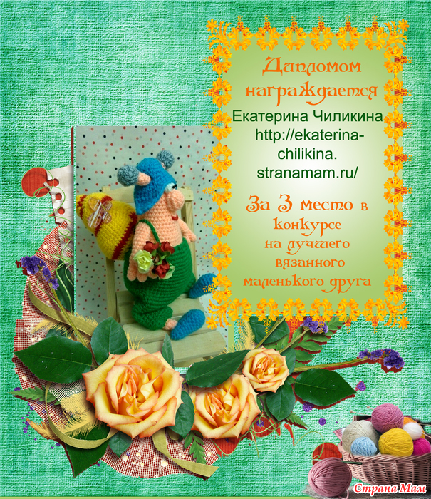 . Я не очень люблю участвовать в конкурсах, но решила все же поддержать компанию и поучаствовать в конкурсе " Мой маленький друг". Как раз увидела один замечательный пост Ирины под ником Сократовна, с текстильным улитом https://www.stranamam.ru/post/11813357/, я в него влюбилась и захотела такого же, но так как я не умею рисовать и грунтовать то приходилось только мечтать, но Ирина скинула мне ссылку на вязанного улита, за что я ей благодарна. И мы с ним заняли третье место