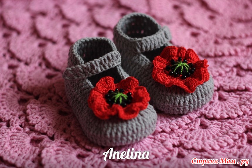 Туфельки с маком связаны из моей любимой пряжи джинс крючком №2