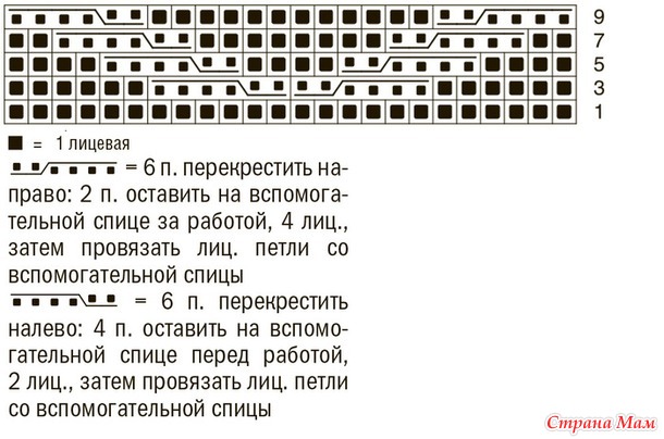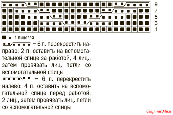 3-й ряд: 8 п. перекрестить направо: 4 п. оставить на вспомо- гательной спице за работой, 4 лиц., затем петли со вспомогательной спицы провязать лиц.