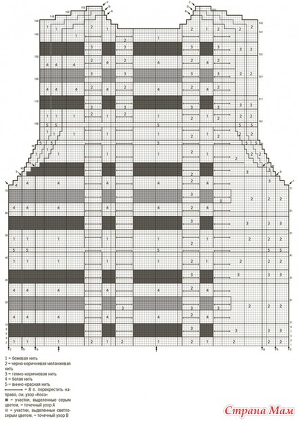Вязать по приведенной схеме в жаккардовой технике лицевой гладью. На схеме спинка приведена полностью.