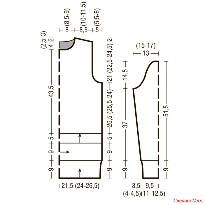 Через 26 (25,5) 24 cм = 80 (76) 72 р. выполнить с обеих сторон проймы, как показано на схеме = 78 (8) 98 п.