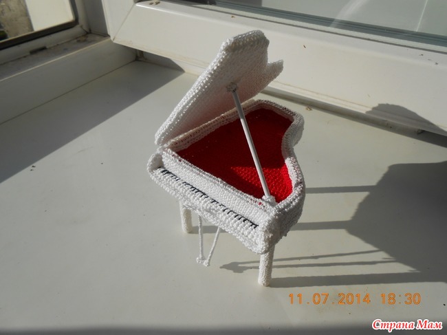 А вот уже полностью довязаны - штульрама, нижняя дека и бока рояля. Внимание - когда довязана нижняя дека и начинается вязание "стенок", стоячих боков рояля - три бока вяжутся на крае нижней деки, а четвёртый бок (там, где должна быть клавиатура)вяжется н а д р у г о м крае штульрамы, не на нижнем её борте, а на верхнем.