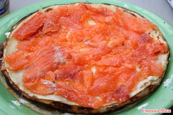 На следующий блин разложите тонко нарезанную рыбу. Подойдет слабосоленая семга, форель, кета, нерка и т. п. Чередуйте слои сыра и рыбы, пока не кончится либо начинка, либо блины.