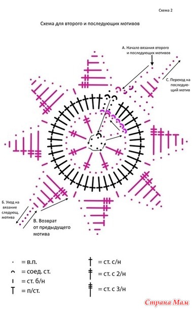 Мотив закончен. Возвращаемся к недовязанному 3-му ряду предыдущего 2-го мотива. На схеме это точка В для 2-го мотива и точка С для 3-го.