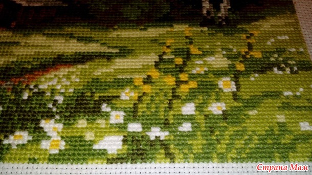Вышивала я его одновременно с другими процессами, так как чередовала шерсть и мулине, многообразие зелени и другие цветовые гаммы.