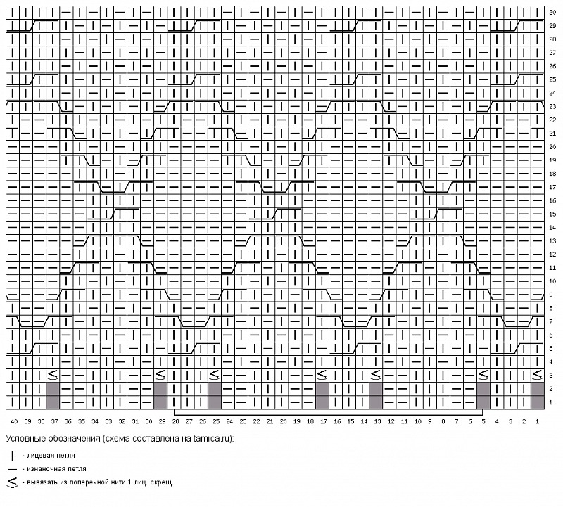 2. перейти на спицы большего размера и вязать ряд 3 схемы №1. В этом ряду выполняются прибавки для перехода к основному узоры, за ряд нужно прибавить 16 петель.
