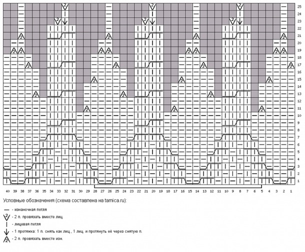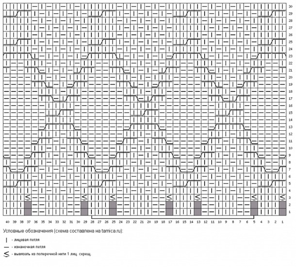 3. продолжить вязание по схеме №1 (с 4 по 30 ряды, повторять петли выделенного рапорта), затем перейти к схеме №2 (с 1 по 25 ряды). При уменьшении количества петель на спицах перейти на чулочные спицы, чтобы избежать растяжения полотна.