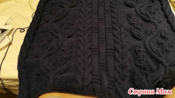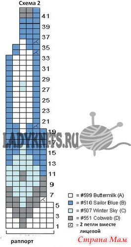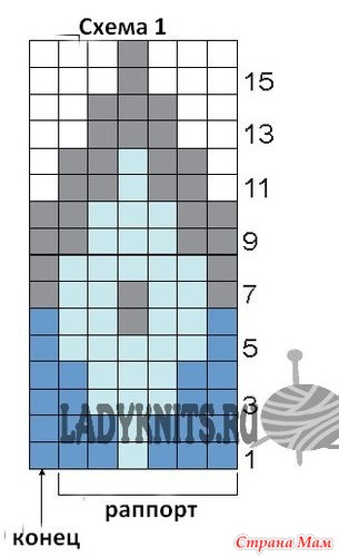Перехoдим на спицы 5 мм и вяeм узором по схеме 1., когда схема будет закончена перейти опять на спицы 4.5 мм и вяжем только белой (А) нитью лицев. гладью.