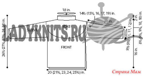 Перед, спинку и рукава вяжем прямыми рядaми до пройм, кокету и горловину вязать по кругу.