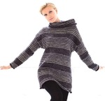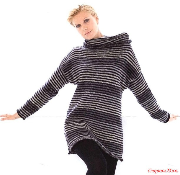 Сборка: выполнить плечевые швы. Рукава втачать. Выполнить боковые швы и швы рукавов. Для воротника перевести отложенные петли на круговые спицы и связать сначала 10 см лиц. гладью полосатым узором, затем след. 15 см — изн. гладью полосатым узором. Петли свободно закрыть.