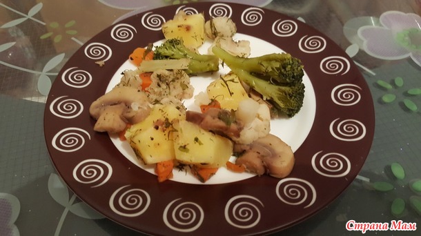 Я очень рада! И первое моё блюдо - овощи с грибами на пару.