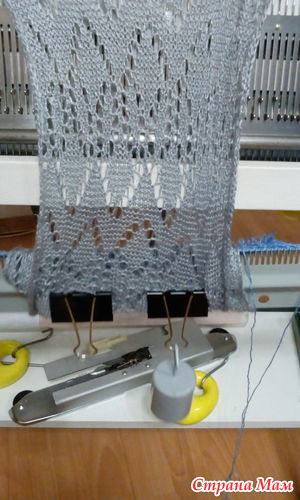 У меня сильвер двухфантурный, есть гребенка и к ней гири.....когда полотно до пола достает, это шарфы, снуды я поворачиваю гребенка вместе с полотном и вешаю на гребенку по краям по гире, еще в комплекте 2 грузики для оттяжки края полотна ( кошки) их я перевешиваю через 10 см, так чтоб край был всегда натянут иначе петли могут полететь .
