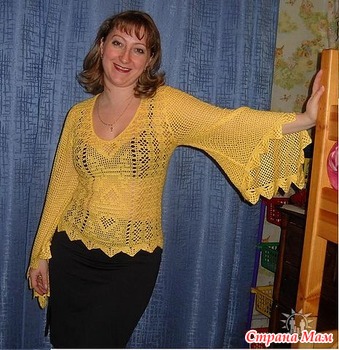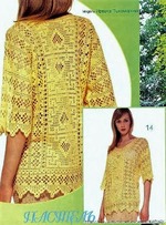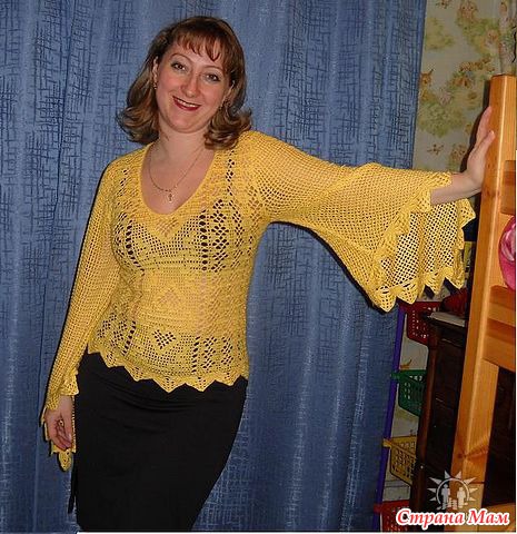 . Желтая туника с узором сердечки. Филейное вязание.