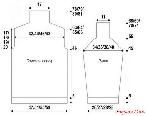 Спинка и перед: набрать 79/85/91/99 п. и вязать резинкой 1/1. Через 5 см убавить 1 п. = 78/84/90/98 п. и вязать следующим образом: 5/8/11/15 п. жемчужным узором, *16 п. косой, 10 п. жемчужным узором*, выполнить от * до * 2 раза, 16 п. косой, 5/8/11/15 п. жемчужным узором. Через 46 см от наборного края для пройм закрыть с обеих сторон в каждом 2-м р.: 1 х 2 п., 2 х 1 п./ 1 х 3 п., 1 х 2 п., 1 х 1 п./ 1 х 3 п., 1 х 2 п., 2 х 1 п./ 1 х 3 п., 2 х 2 п., 2 х 1 п. = 70/72/76/80 п. На высоте 63/64/65/66 см от наборного края для скосов плеч закрыть с обеих сторон в каждом 2-м р.: 3 х 4 п., 3 х 3 п./4 х 4 п., 2 х 3 п./ 6 х 4 п./ 2 х 5 п., 4 х 4 п. На оставшихся 28 п. вязать далее для воротника. Через 78/79/80/81 см от наборного края закрыть все п. воротника.