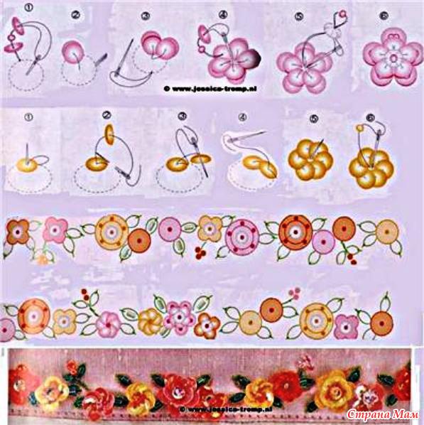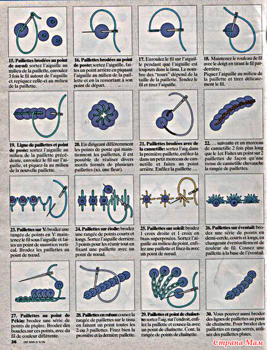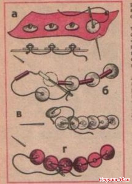 Если необходимо пришить несколько пайеток, частично перекрывающих друг друга, то работа осуществляется таким образом: продев иглу в отверстие первой пайетки, возвращаемся ее (иглу) обратно, не затягивая образовавшуюся петельку. Следующий стежок делается с изнанки у края пайетки, при этом вышедшая налицо игла захватывает петельку, фиксируя ее. Смотрите на крайнем справа рисунке.