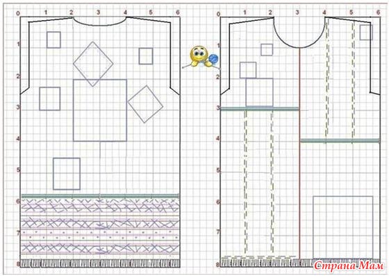 Поиск по картинке ни в чем мне не помог. Определилась только с тем, что буду вязать разные квадраты и разбрасывать их в беспорядке по кардигану. Начала с выкройки. Взяла в интернете и подогнала под свои размеры.