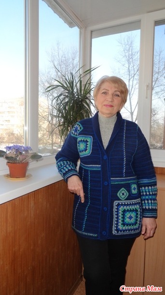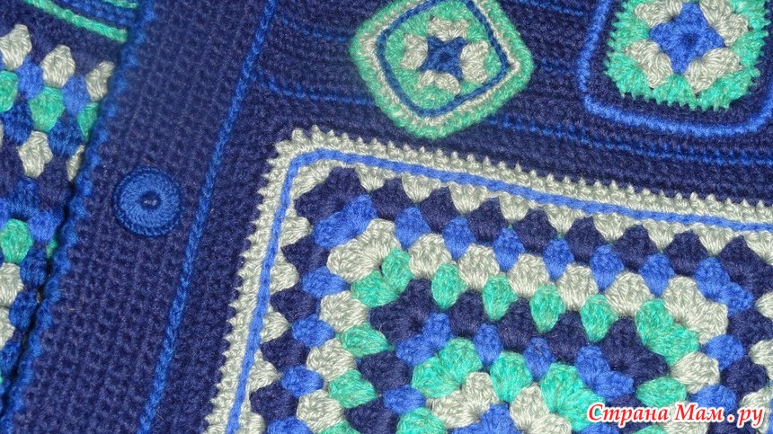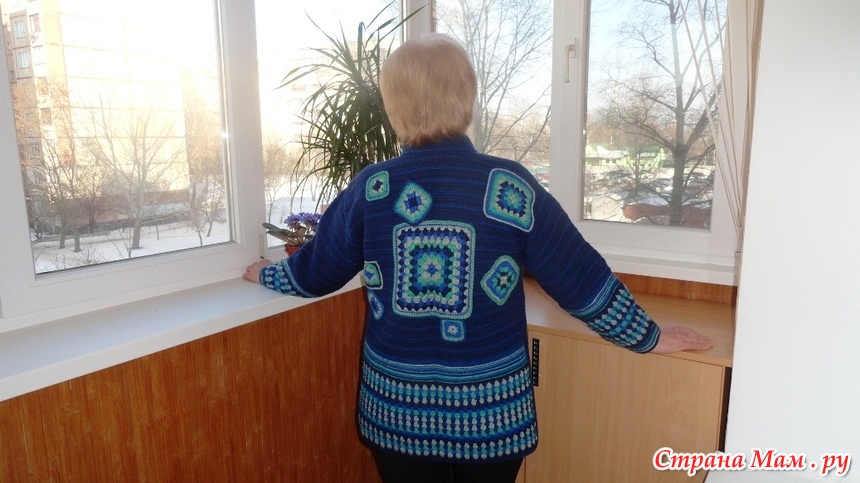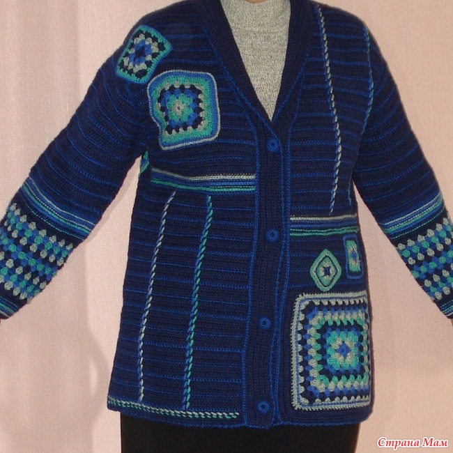 Поиск по картинке ни в чем мне не помог. Определилась только с тем, что буду вязать разные квадраты и разбрасывать их в беспорядке по кардигану.