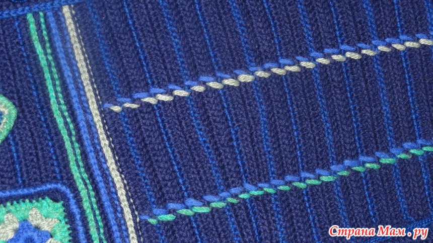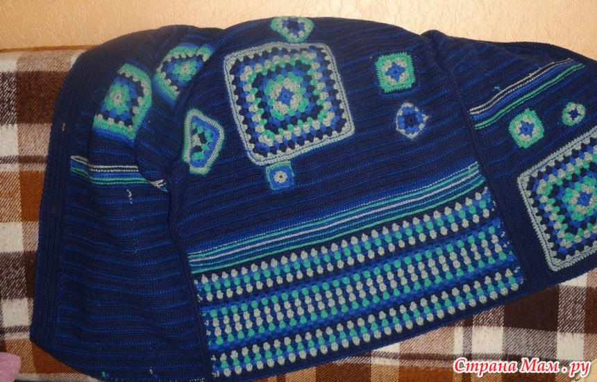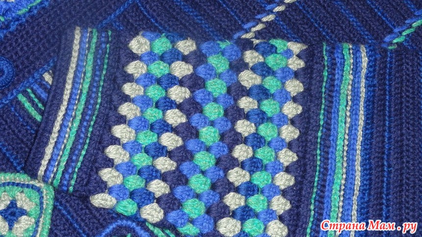 Узоры. 1) Основной из 2х рядов: 1й ряд столбики с 1 накидом, 2й ряд столбики без накида. Связав разные образцы простых узоров, поняла, что именно такая вязка устраивает меня (по плотности, мало тянется, почти не деформируется). Каждый 4-й ряд голубой, темно-синих ниток могло не хватить ну и чтобы было не так мрачно. 2) Бабушкин квадрат все знают. 3) Полосы вязались по принципу бабушкиного квадрата.