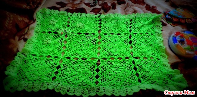 Зеленый плед в коляску из мотивов. Пряжа VITA Camilla (4605 - Ультра-салатовый), Вес мотка: 100 г, Длина нити: 300 м, Состав: 100% акрил. Объвязывала пряжей VITA "BABY" - (2878 - Ультра-салатовый). Вязала в подарок подруге. Плед получился очень мягкий.