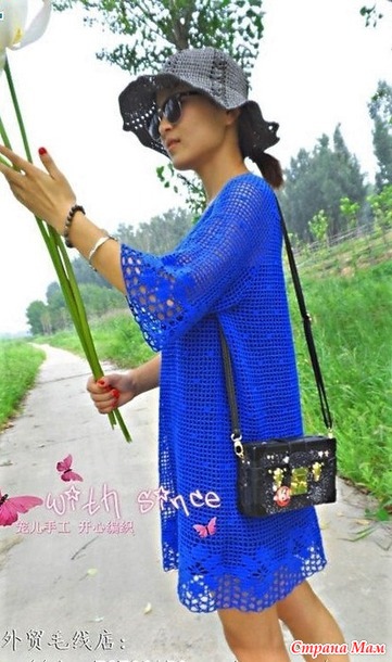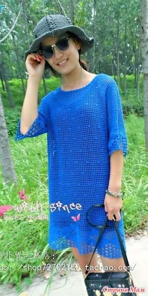 Это платье цвета ультрамарин вяжется простым сетчатым узором от плеча и смотрится очень благородно. Благодаря силуэту оно подойдет любой фигуре.