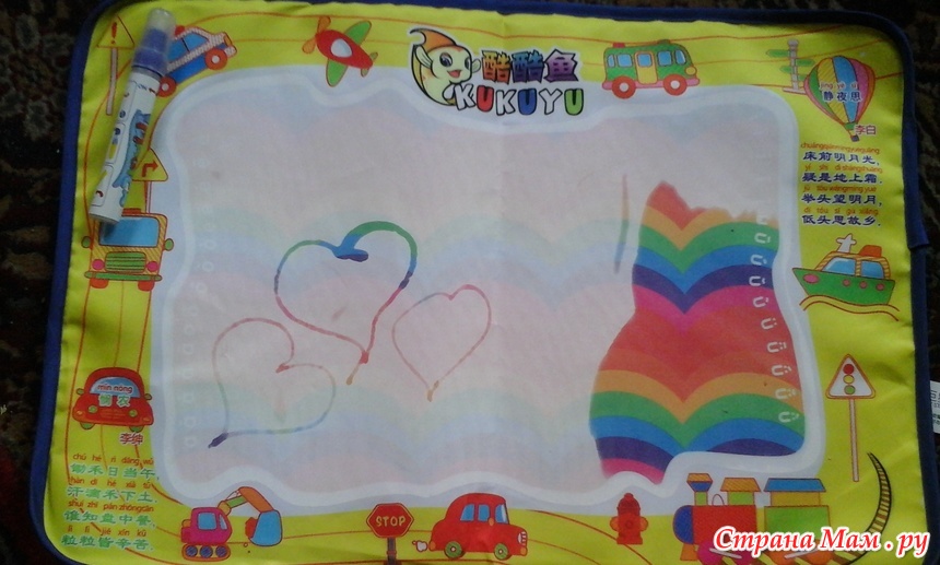 Давно такой хотела, выбрала именно такой - с разноцветным фоном. В специальный маркер надо налить воду и рисовать, после высыхания рисунок пропадает. На фото справа яркое пятно - это дети налили воды.