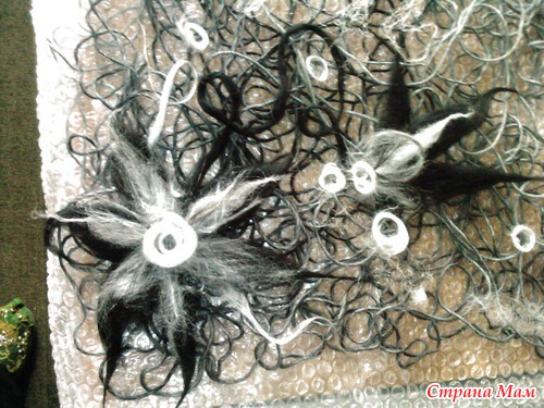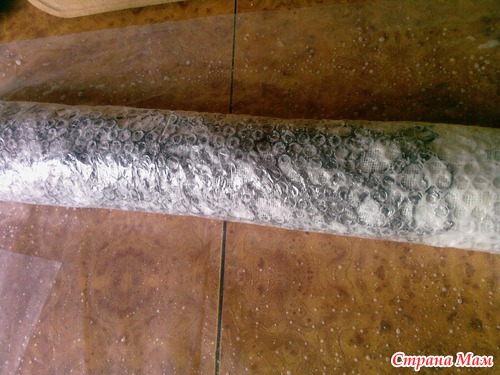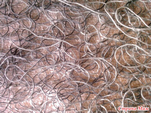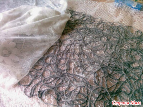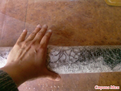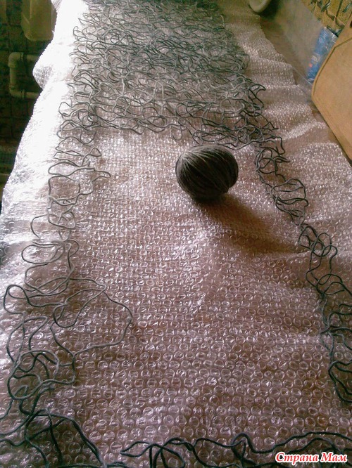 На клеенке разложить пупырчатую пленку и начать кольцами выкладывать пряжу. Сначала по краю, чтобы определить границы, затем - заполняя все поле.