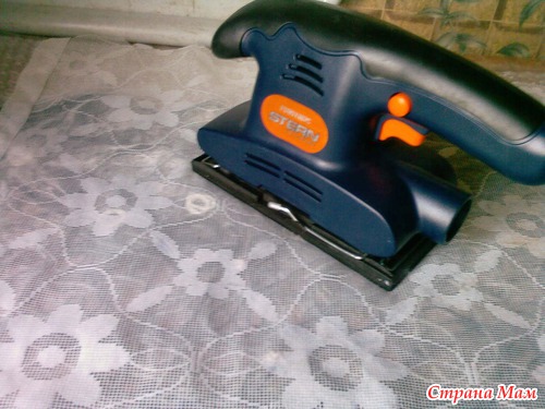 Теперь накрываем все сеткой и смачиваем теплой мыльной водой. Не сильно, чтобы вода не текла. Пригладить все руками, затем шлифмашиной. Если таковой не имеется (сама только недавно приобрела), просто хорошо разгладить, чтобы все равномерно смочилось. Сильно не трите, чтобы не сместить нити.