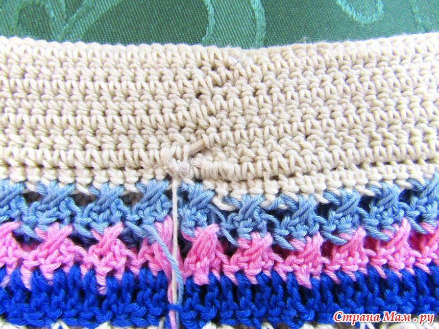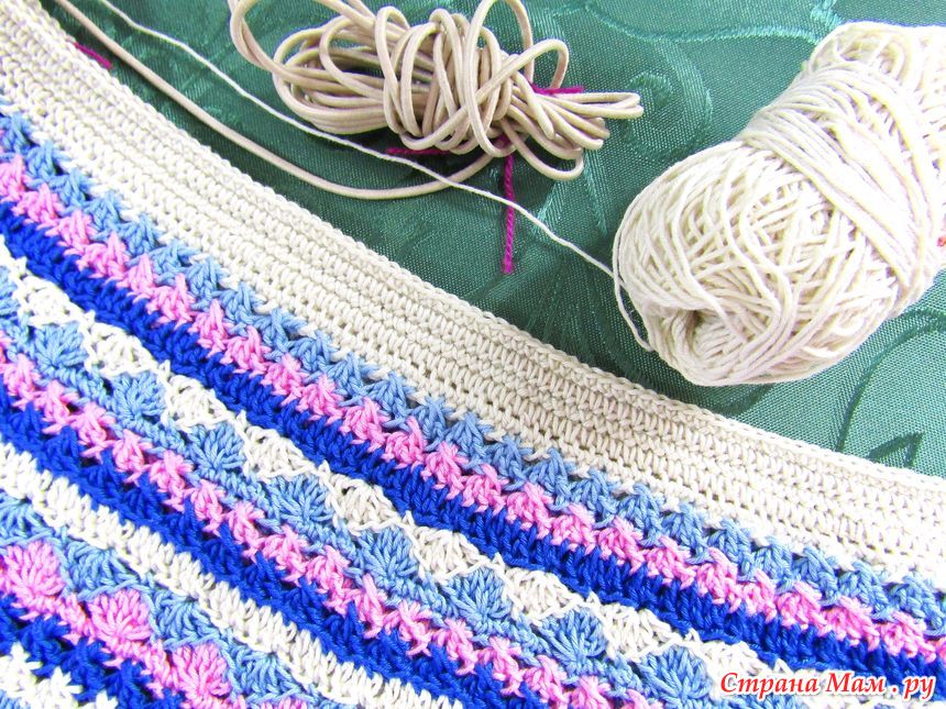 В пояс ввязывала шляпную резинку, в этот раз решила ее не разрезать. Вязала по кругу без петли подъема.