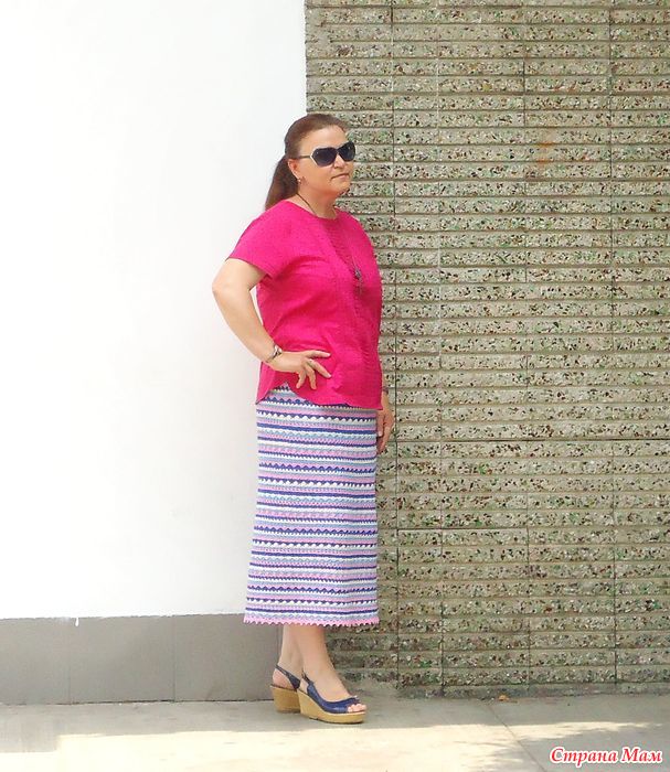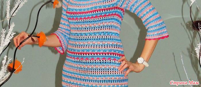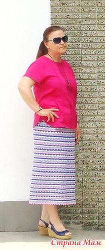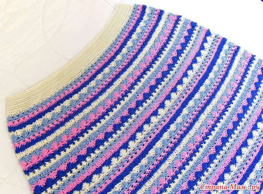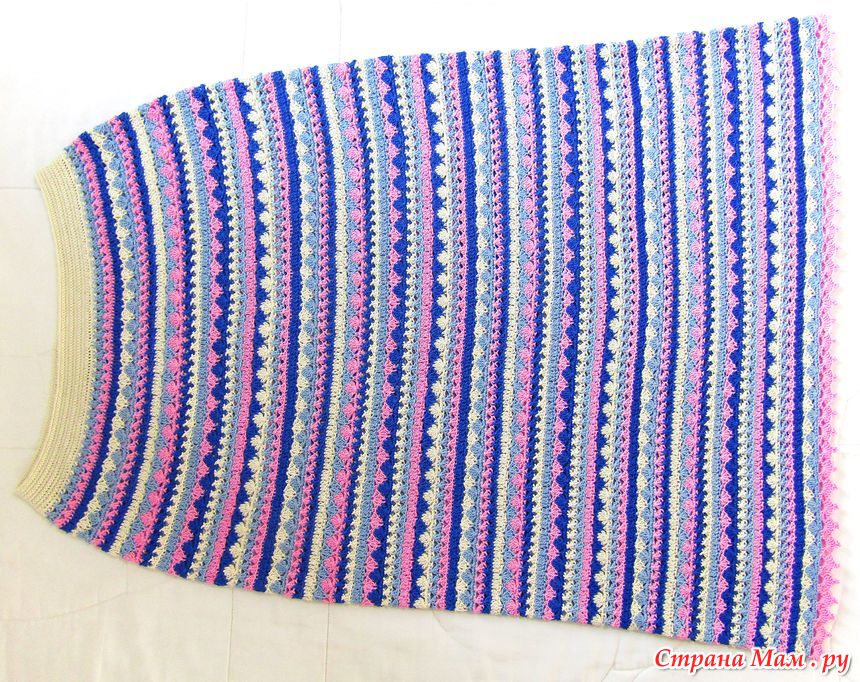 Затем до середины юбки добавляла в каждом мотиве по 6 петель, а потом в одном прибавляла 6 петель, в другом ничего не добавляла, так чередовала до низа юбки.