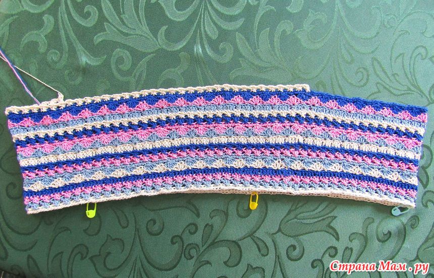 Делала прибавку 4 см. От пояса до бедер по расчетам нужно было добавить 54 петли, в 1 мотиве добавила 18 петель в трех последующих по 12.