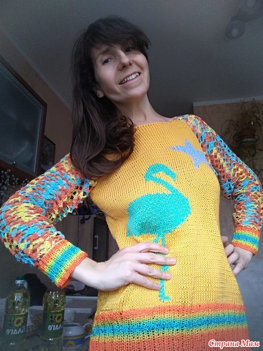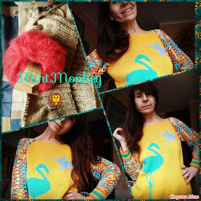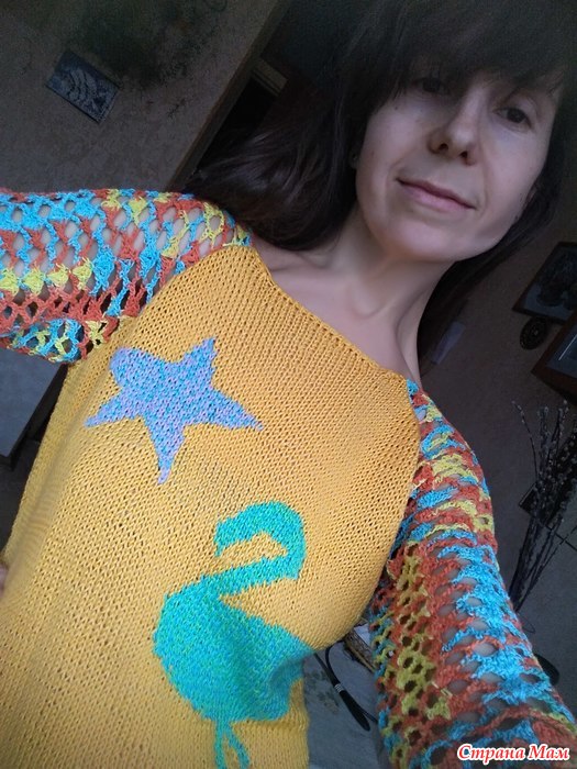 Девочки, доброго времени суток! Вязала месяца 4, но главное, что довязала). Перед и спинка связаны спицами (#3), а рукава крючком (#3,5). Не могу сказать точно сколько пряжи (х/б) ушло, думаю около 400 г. Сразу хотела реглан: поэтому перед вязала без выкройки, спинку тоже, а вот на рукав пришлось делать, чтобы получился росток. Схему фламинго и звёздочки легко найти в интернете! У меня они выполнены жаккардом, но можно и сверху вышить. Если есть вопросы, отвечу с удовольствием). Приятного просмотра