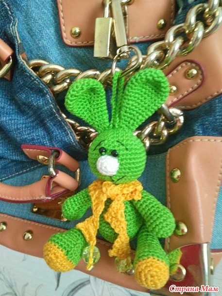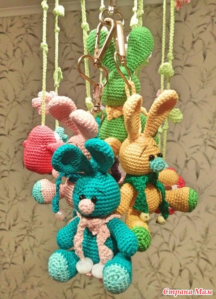 Зайчики-брелочки для сумок, рюкзаков и для многого другого. Связала своим девчонкам, чтобы в школу и садик веселее было ходить. Нитки сосо, крючок 1,5.