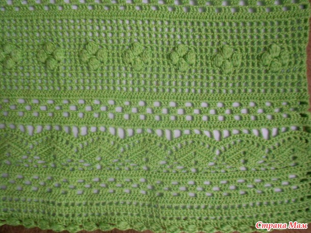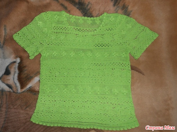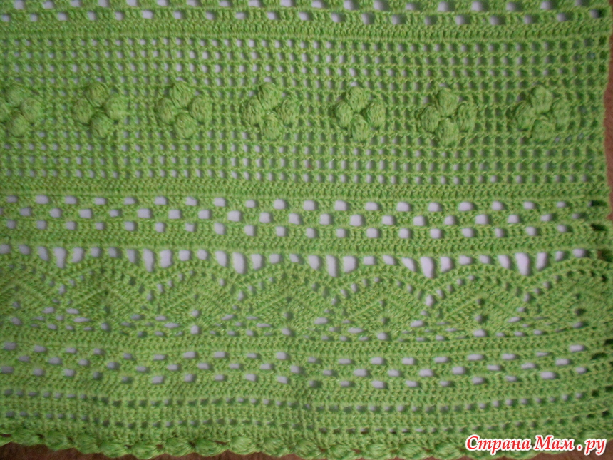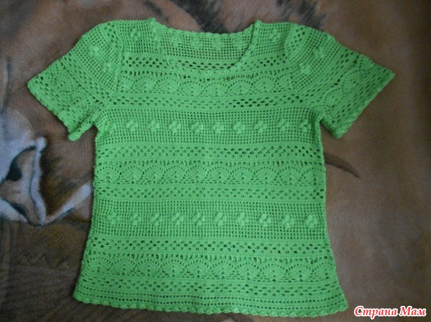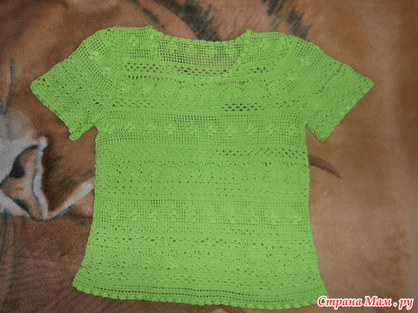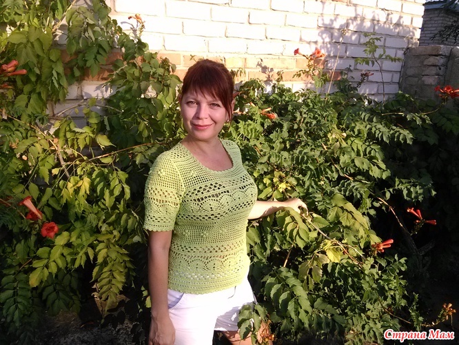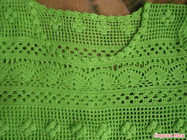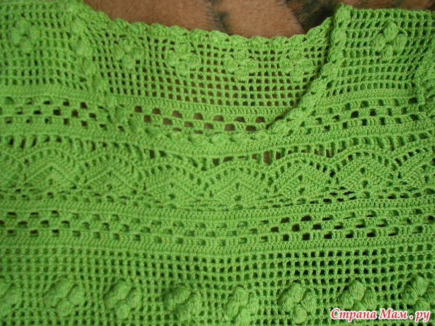 Здравствуйте Страна Мам! Показываю свою работу: "Зеленая кофточка", вдохновилась я работой одной из жительниц Страны Мам, к сожалению, я сохранила только ее фото и вязала по нему, поэтому прошу прощения за повтор ее работы, но с другой стороны для того мы и выкладываем свои похвастушки, чтобы кого нибудь вдохновить. Связала кофту из пряжи "Денди " от Камтекс, понравилась в работе, добавила одну нить бобинной "Нежность", так как в одну "денди" было тонковато. Крючок № 1,5. Ушло 300 грамм пряжи. Теперь фото